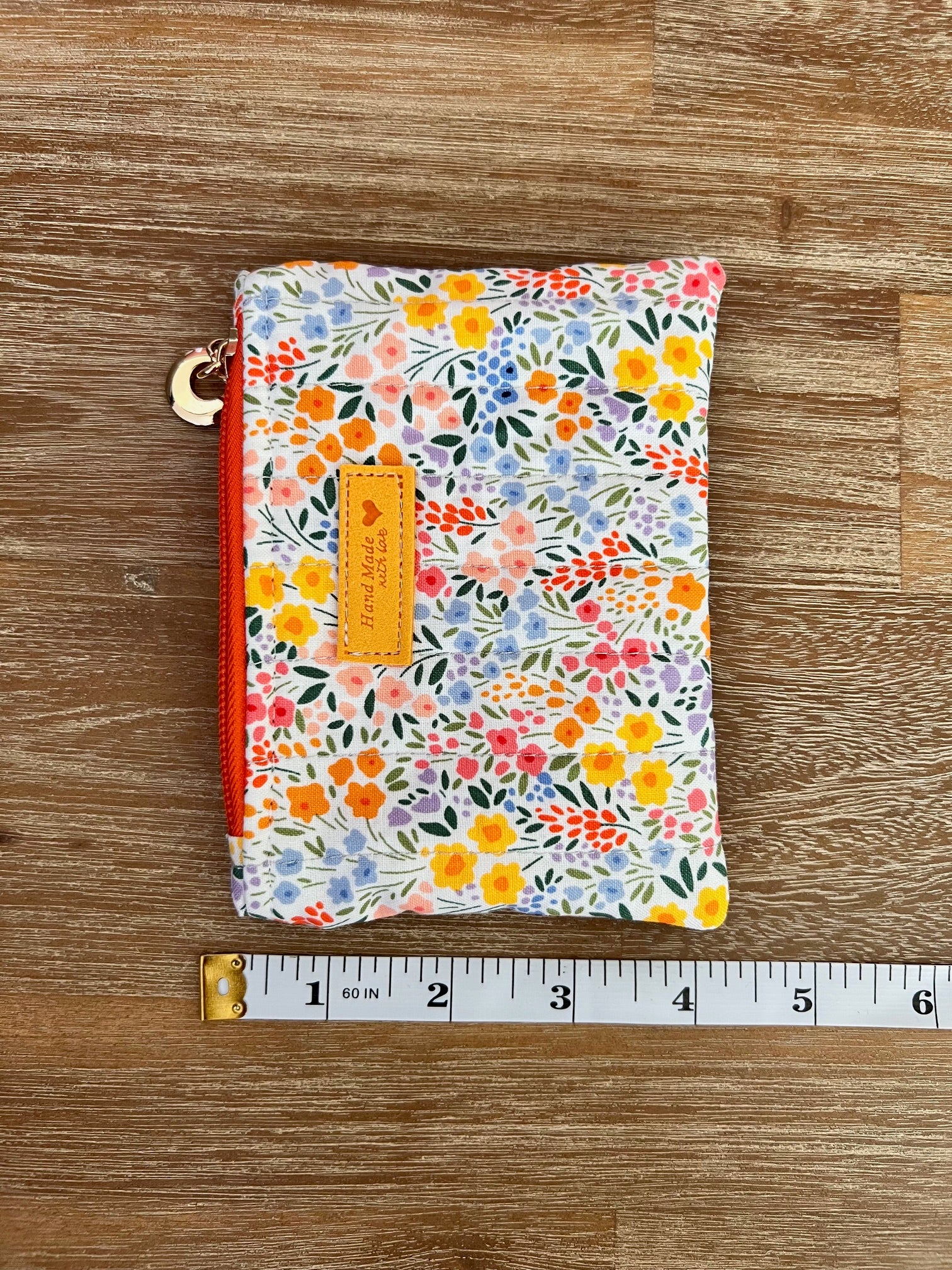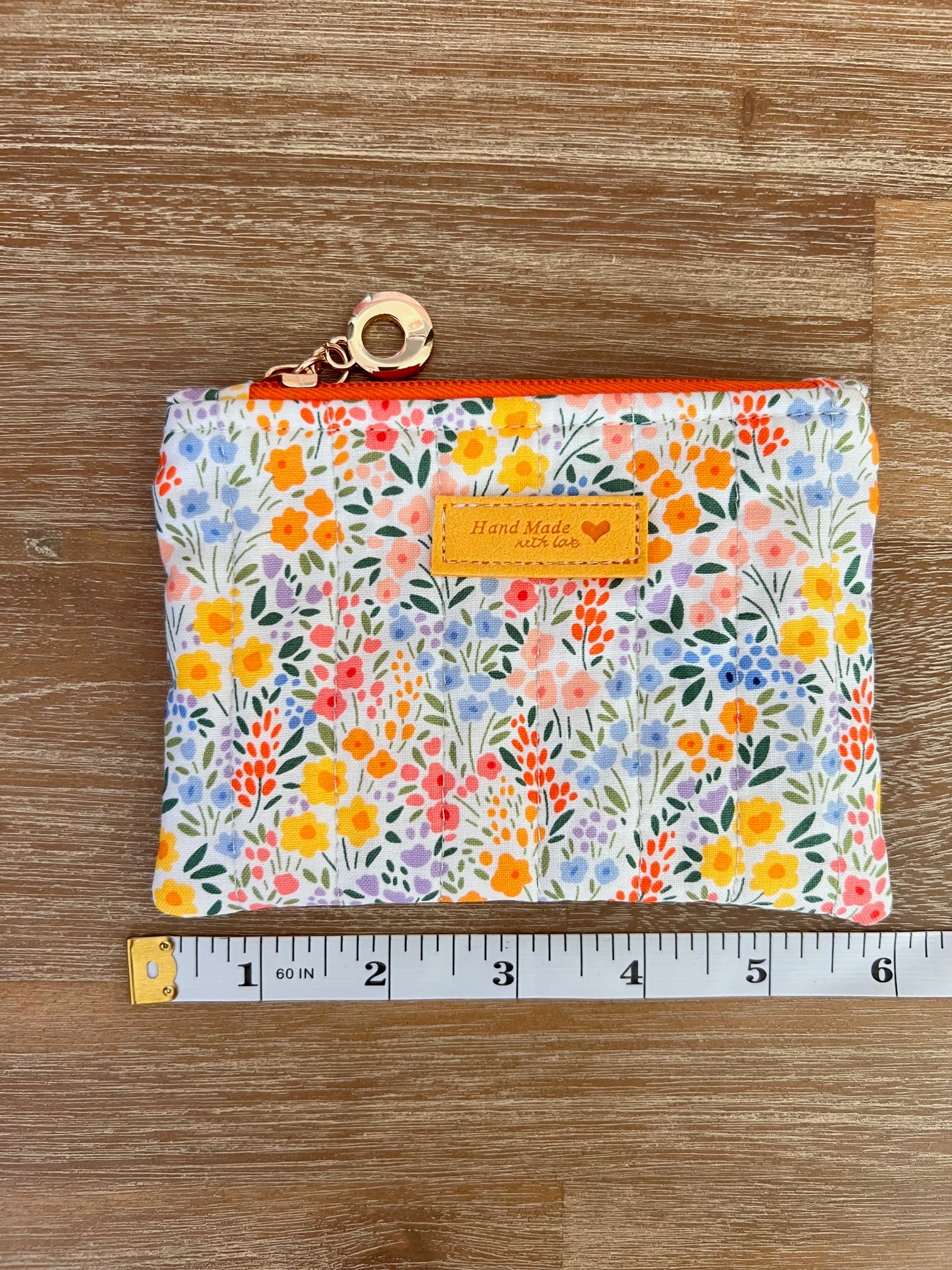 Keep your small essentials close and your style blooming with this handmade coin purse in our signature floral cotton print. Featuring cheerful blossoms in yellow, orange, purple, and pink on a crisp white background, this compact pouch is perfect for coins, cards, lip balm, or keys—and it clips right onto your wristlet for easy access on the go.