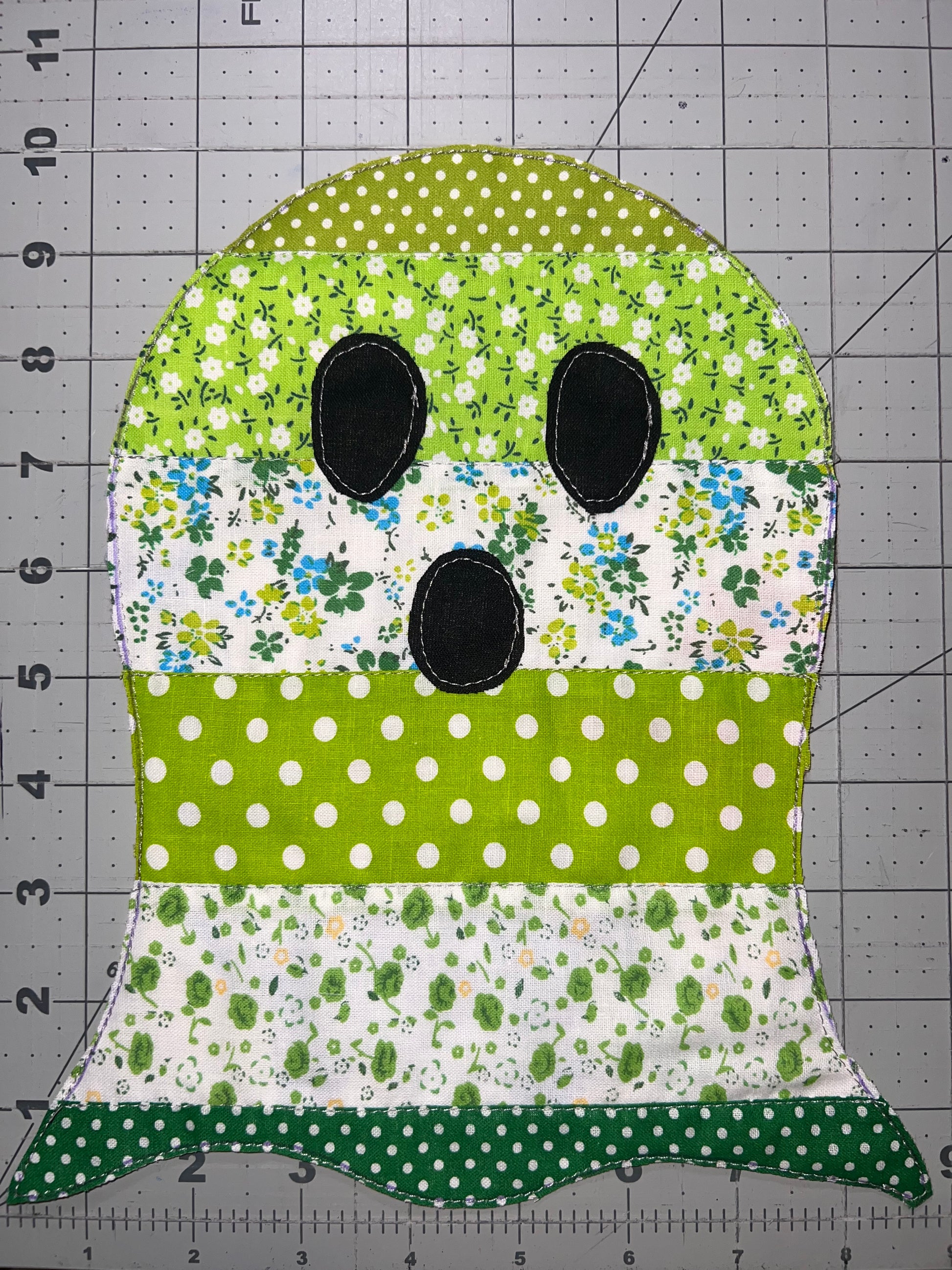 This ghost isn’t here to scare—it’s here to charm! Made from a cheerful mix of green florals and polka dot prints, each quilted appliqué brings a garden-fresh twist to Halloween crafting. Whether you're dressing up a shirt, tote, or trick-or-treat pouch, this little ghoul adds a pop of personality and handmade magic.