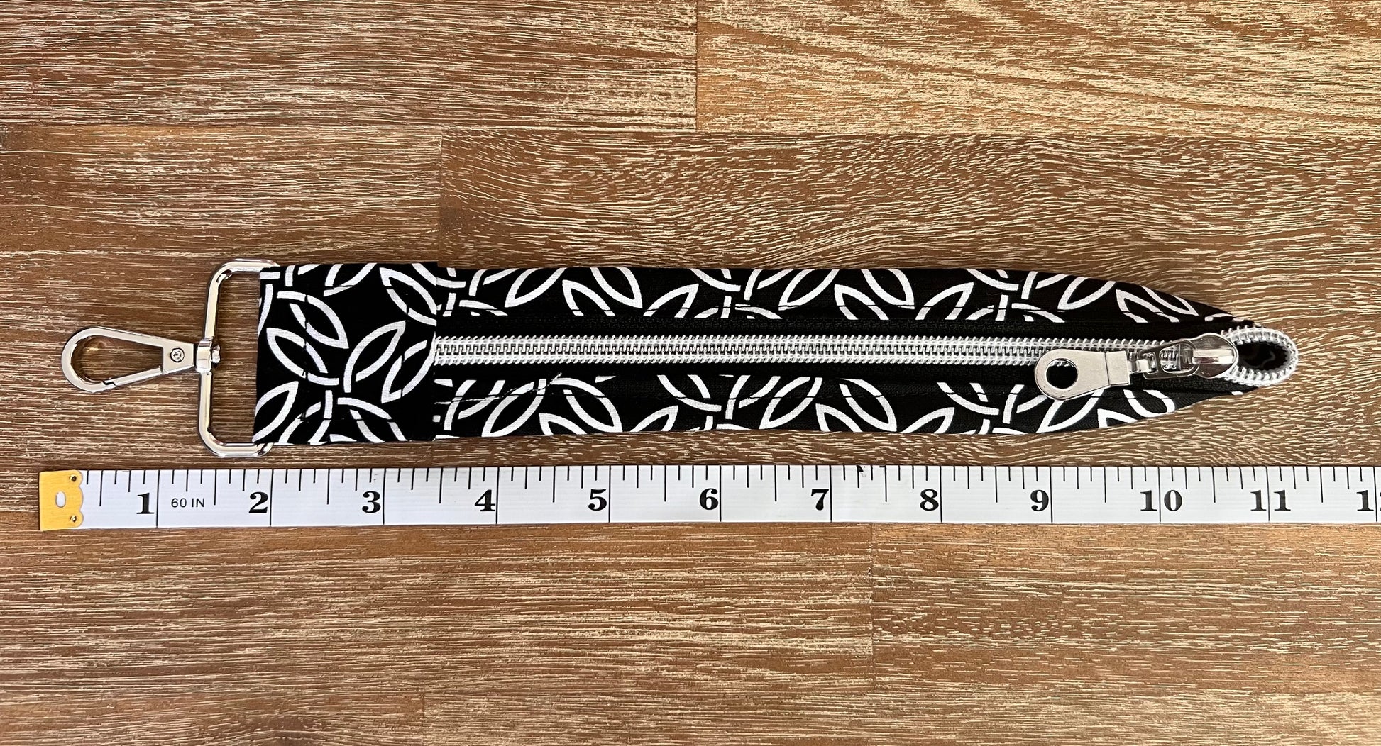 •   Available in 10-inch or 12-inch lengths, both 1.5 inches wide. This is the 10" wristlet